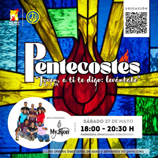 Los jóvenes de las zonas Talca Ciudad y Talca Rural se reunirán desde las 18:00 hrs. en la Parroquia Inmaculada Concepción de Talca (14 Oriente Esquina 3 1/2 Sur) para la gran Misa de Envío, siendo presidida por Monseñor Galo Fernández Villaseca, Obispo de Talca. Anita Flores, Coordinadora Zonal de Talca Ciudad nos comenta que “este año en el fondo Pentecostés está enfocada nuevamente a este lema pastoral que tenemos “Joven a ti te digo levántate”, nuestro lema diocesano que invita principalmente a motivarnos, a que todos participemos de esta venida del Espíritu Santo. Este año, al igual que el año pasado será en la parroquia Inmaculada Concepción, pero tenemos una participación importante ya que después de la misa de envío va a haber una pequeña fiesta al Espíritu, y esta fiesta va a estar animada por el grupo My-Sion, para que luego los jóvenes vayan a sus respectivas parroquias a celebrar la Vigilia”.